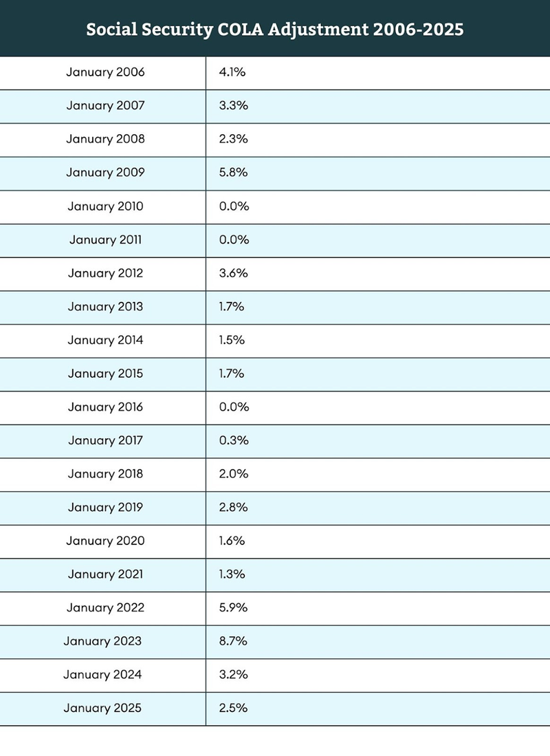 Unlike some private pensions, Social Security benefits can be adjusted annually for inflation. This Cost-of-Living Adjustment (COLA) is designed to help maintain the purchasing power of your benefits over time, potentially managing the impact of inflation in retirement. According to the Social Security Administration, the COLA for 2025 is 2.5%. This follows an 8.7% COLA for 2023, one of the most significant increases in recent history due to high inflation the year before. Note that there is not always a COLA increase every year. As the chart shows, there were three times in the past 20 years when beneficiaries received no COLA due to a lack of inflation. (3)